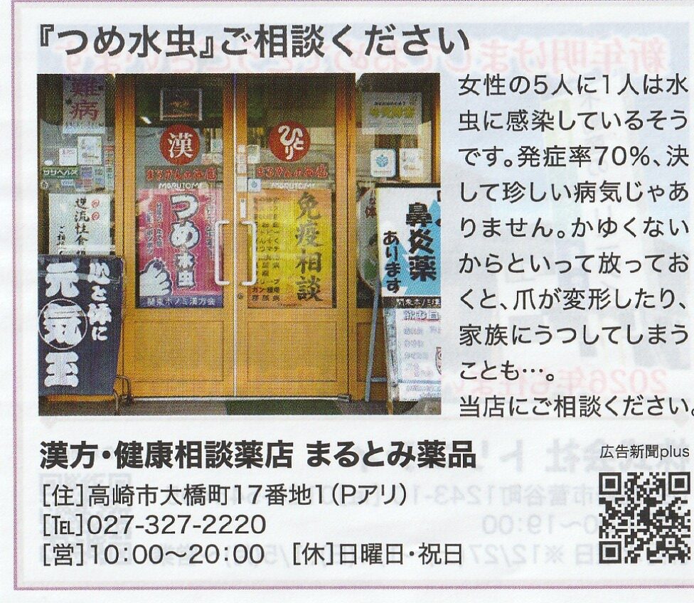 本日、群馬県の中央地区・西毛地区にお住いの皆様、折り込みチラシが配布されました。QRコードをスマホで読み取ってくださいね。気にな、人には言えない水虫の症状、最近は季節を問わず爪水虫で悩む方が多くなってます。